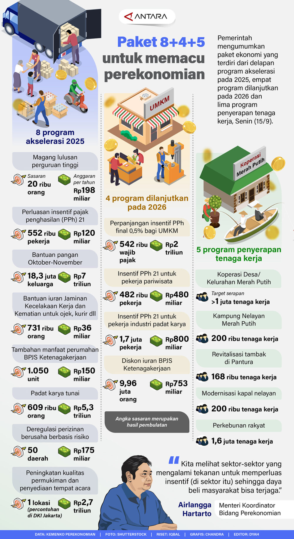 Pemerintah mengumumkan paket ekonomi yang terdiri dari delapan program akselerasi pada 2025, empat program dilanjutkan pada 2026 dan lima program untuk penyerapan tenaga kerja, Senin (15/9).(ANTARA)