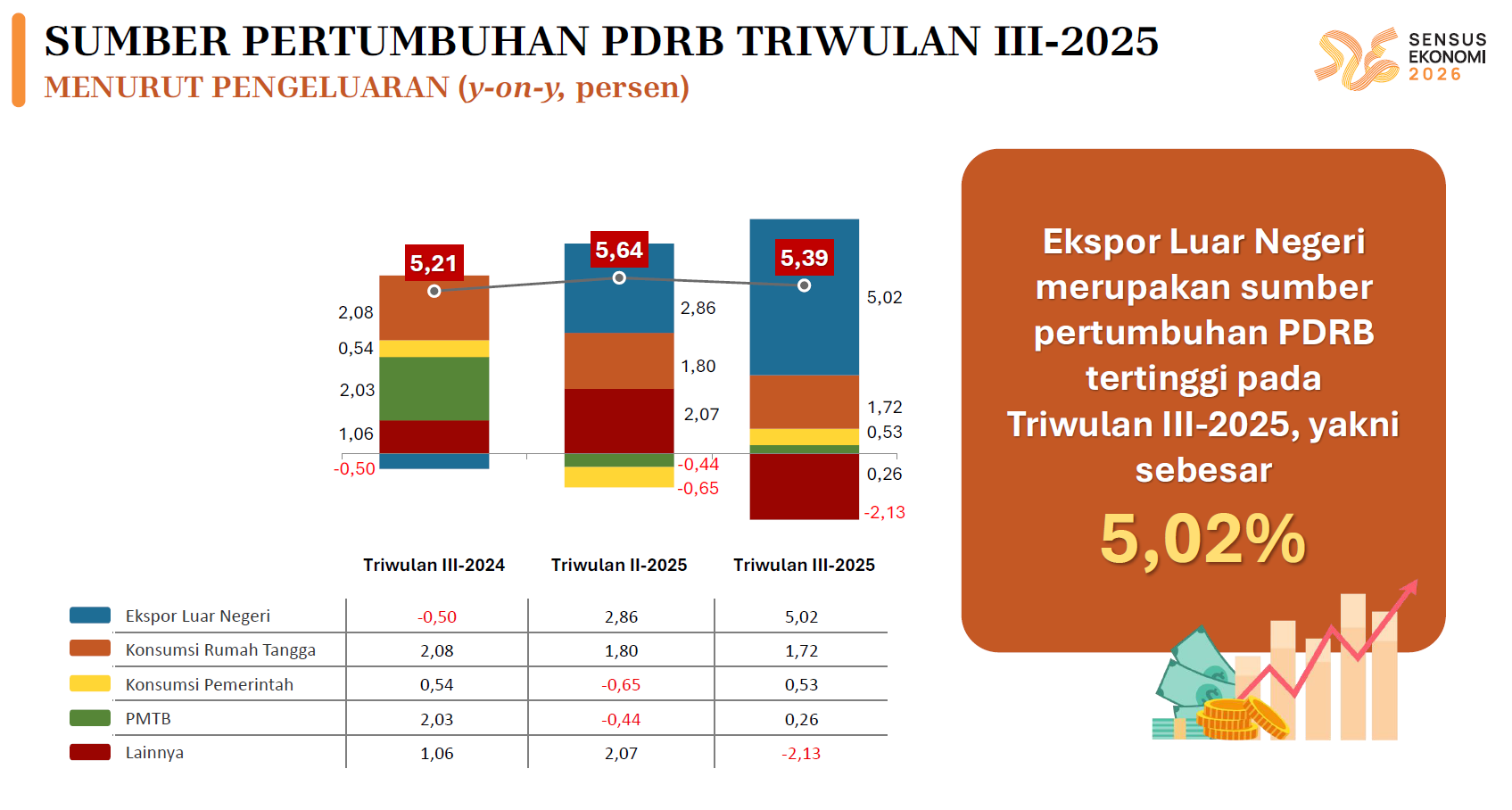 Sedangkan pada triwulan II-2025, ekspor luar negeri tumbuh 21,70% dan memberi andil 2,86% dari pertumbuhan ekonomi pada triwulan II 5,64%.