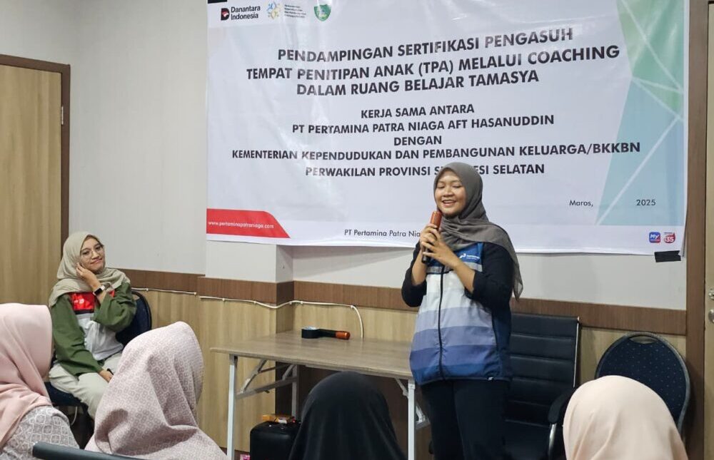 Barometer.co.id-Maros. PT Pertamina Patra Niaga Regional Sulawesi melalui Aviation Fuel Terminal (AFT) Hasanuddin kembali menunjukkan komitmennya dalam mendukung peningkatan kualitas sumber daya manusia sejak usia dini. Hal ini diwujudkan melalui kegiatan Pendampingan Sertifikasi Pengasuh Tempat Penitipan Anak (TPA) yang dilaksanakan di Ruang Meeting Korpri Lounge, Kantor Bupati Maros.