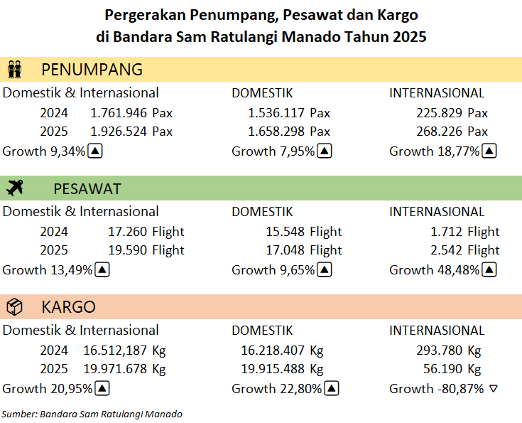 Peningkatan penumpang dan pesawat di Bandara Sam Ratulangi Manado terjadi baik pada penerbangan domestik maupun internasional. Penumpang domestik tercatat sebanyak 1.658.298 orang, tumbuh 7,95% (yoy) dibanding 2024 yang sebanyak 1.536.117 orang. Sedangkan penumpang internasional sebanyak 268.226 orang, tumbuh 18,77% (yoy) dibanding 2024 yang baru 225.829 penumpang.