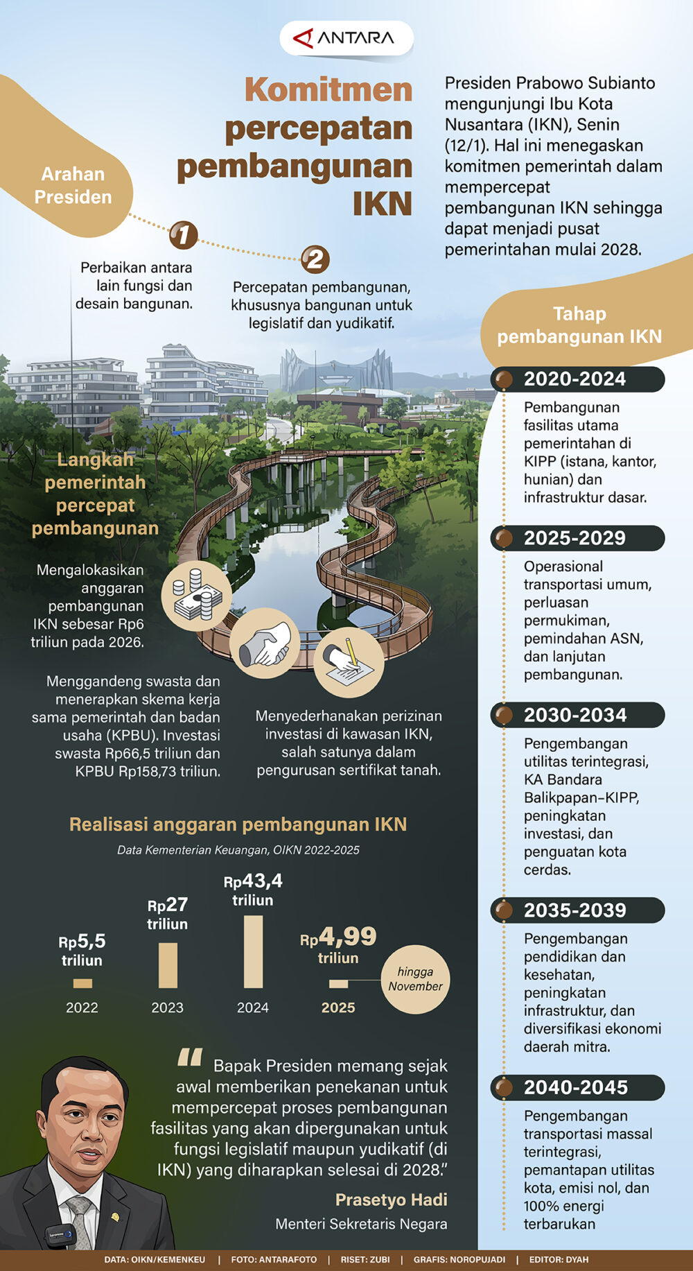 Presiden Prabowo Subianto mengunjungi Ibu Kota Nusantara (IKN), Senin (12/1). Hal ini menegaskan komitmen pemerintah dalam mempercepat pembangunan IKN sehingga dapat menjadi pusat pemerintahan mulai 2028.(ANTARA)