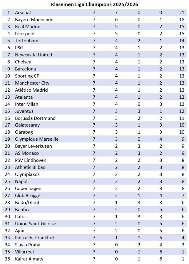 Berikut klasemen Liga Champions 2025/2026 ronde ketujuh: