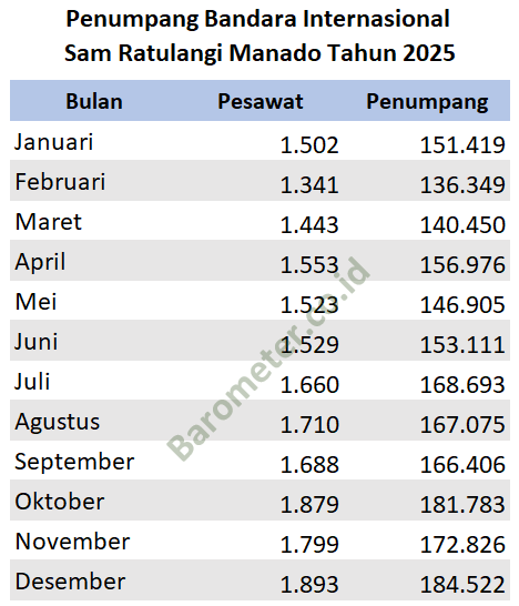 Barometer.co.id-Manado. Penumpang di Bandara Internasional Sam Ratulangi Manado pada bulan Desember 2025 mencatat rekor terbanyak sejak Januari 2020 atau sebelum pandemi Covid-19. Pada bulan tersebut, penumpang tercatat 184.522 orang, sementara pada Januari 2020 sebanyak 200.891 orang.