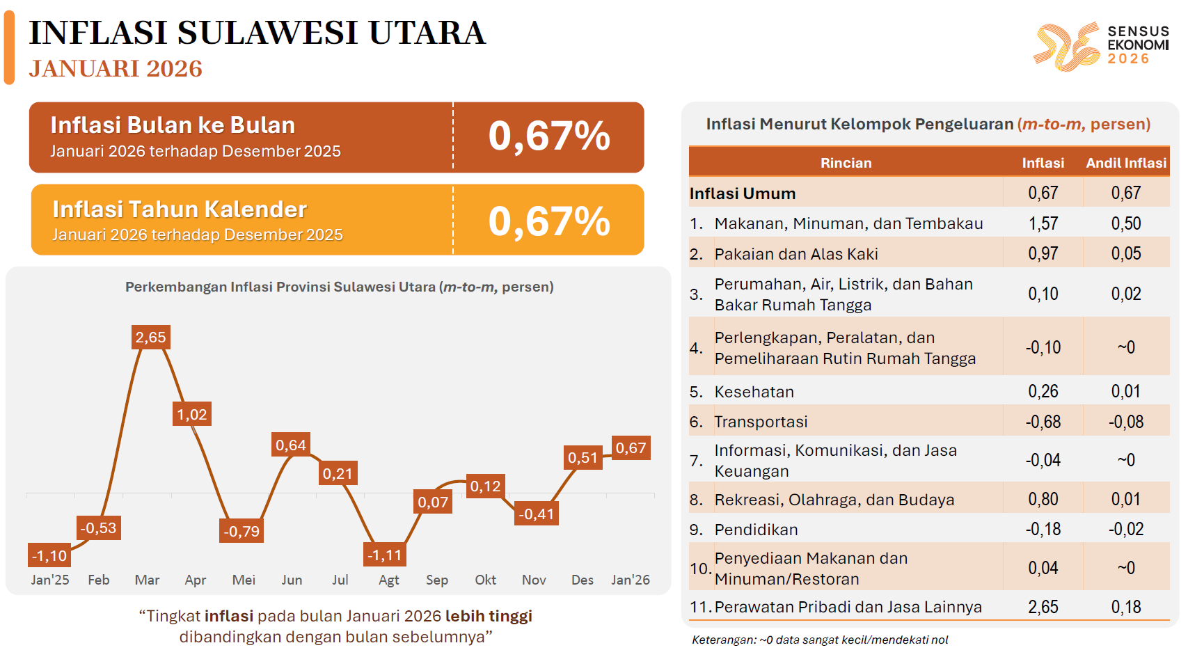Barometer.co.id-Manado. Pada bulan Januari 2026, Provinsi Sulawesi Utara (Sulut) mengalami inflasi 0,67% mtm atau secara bulanan. Tingkat inflasi ini lebih tinggi dibanding bulan sebelumnya, yakni Desember 2025 yang sebesar 0,51%. Sedangkan secara tahunan, inflasi di Sulut mencapai 3,04% (yoy), juga lebih tinggi dibanding bulan Desember 2025 yang sebesar 1,23%.