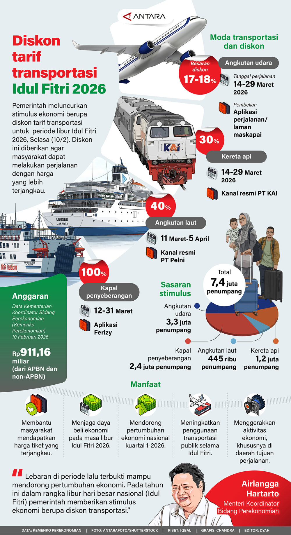 Pemerintah meluncurkan stimulus ekonomi berupa diskon tarif transportasi untuk periode libur Idul Fitri 2026, Selasa (10/2). Diskon ini diberikan agar masyarakat dapat melakukan perjalanan dengan harga yang lebih terjangkau.(ANTARA)