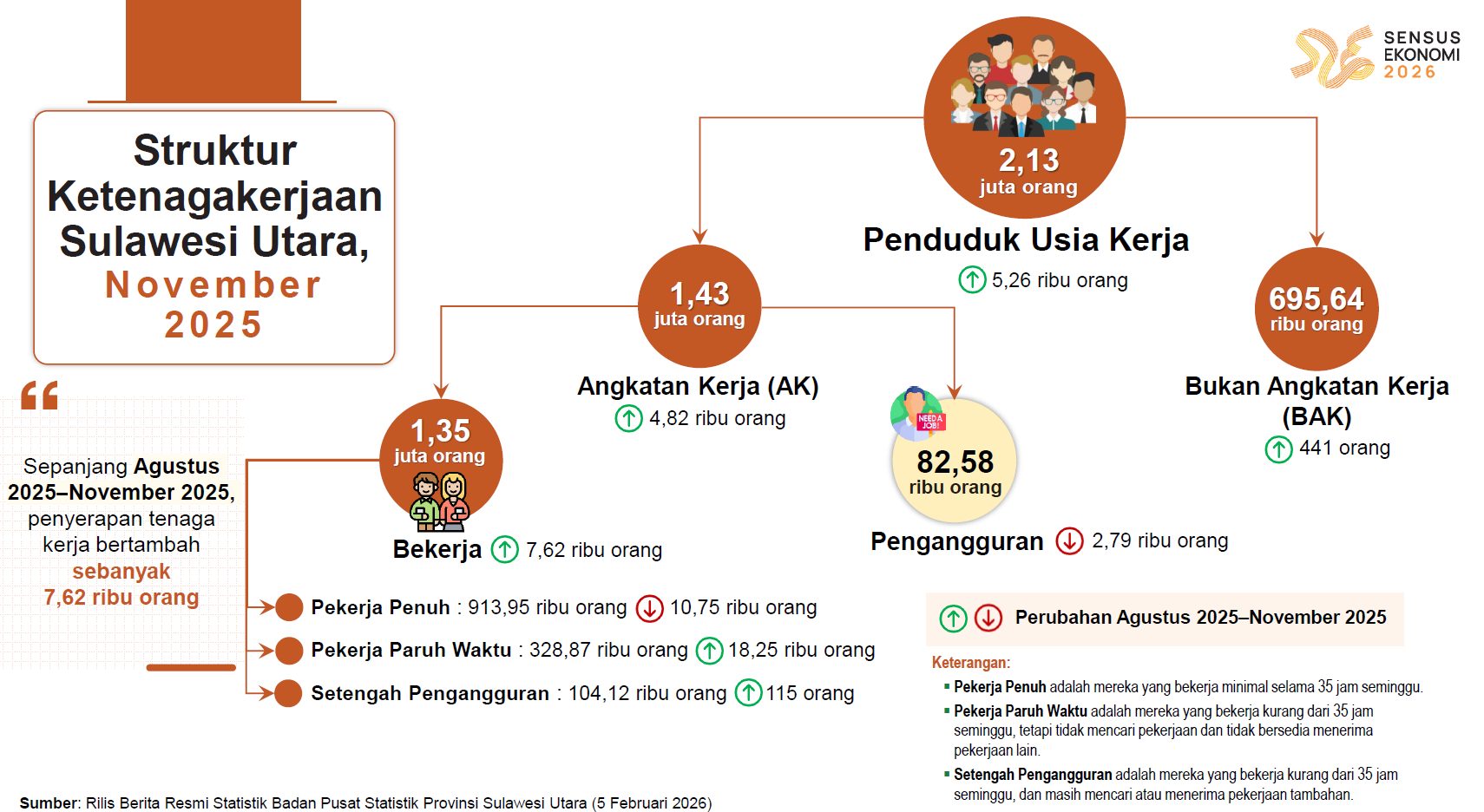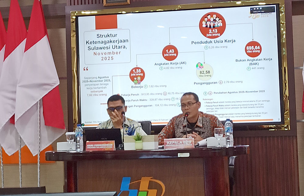 “Dari jumlah angkatan kerja di Sulut pada November 2025 sebanyak 2,13 juta orang, 1,35 juta orang di antaranya bekerja. Jumlah tersebut meningkat 7,62 ribu orang dibanding Agustus 2025. Sementara 82,58 ribu orang menganggur, turun 2,79 ribu orang dibanding Agustus 2025,” kata Agus.