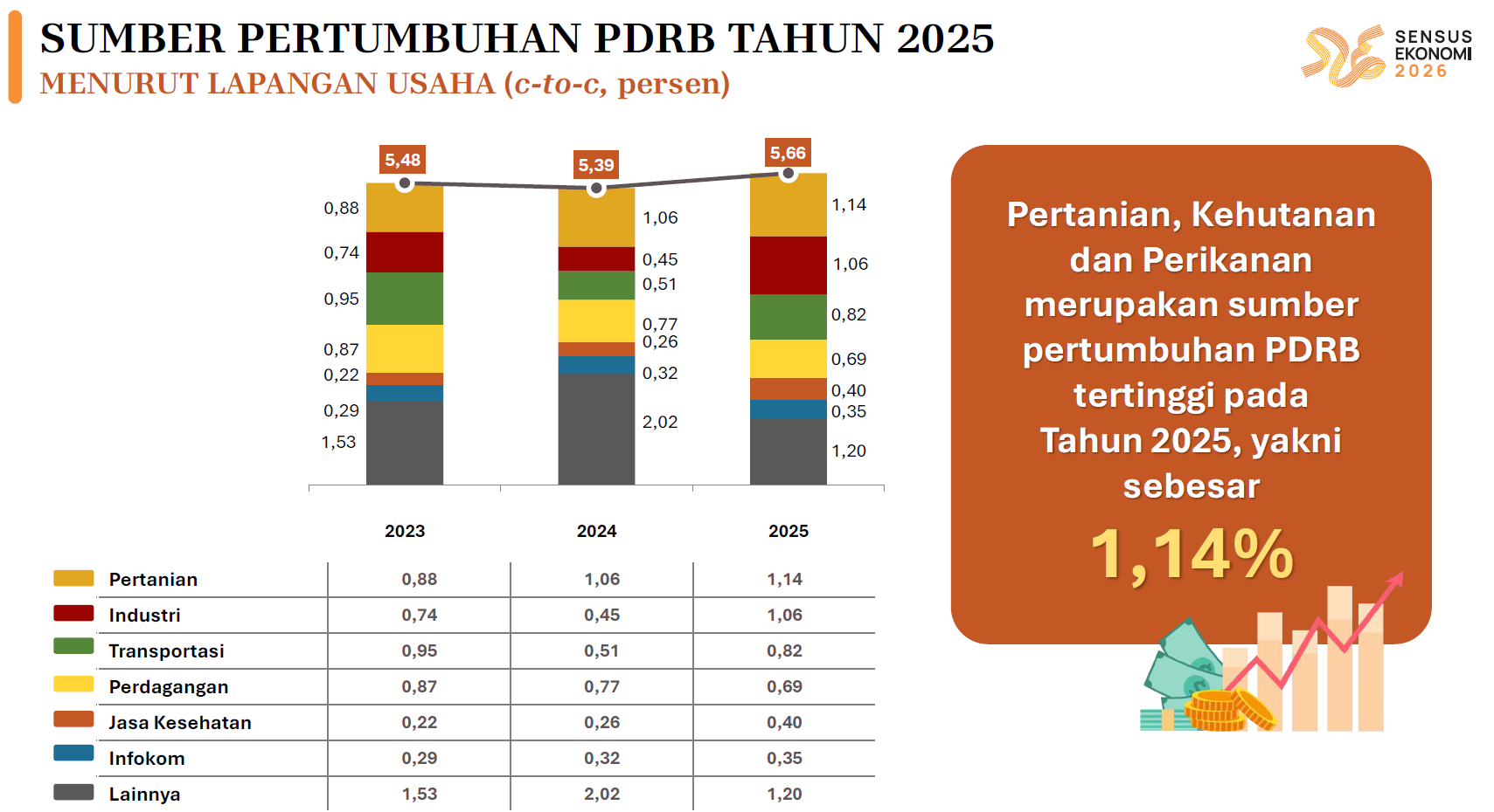Begitu juga dengan sektor Transportasi dan Pergudangan yang mencatat pertumbuhan 9,58% (yoy), lebih tinggi dibannding tahun 2024 yang hanya 5,97%. “Pertumbuhan lapangan usaha Transportasi dan Pergudangan didorong oleh meningkatnya mobilitas masyarakat sepanjang tahun 2025, sehingga permintaan terhadap semua moda transportasi, baik angkutan darat, laut, udara, dan penyeberangan tumbuh signifikan,” ujar Agus.