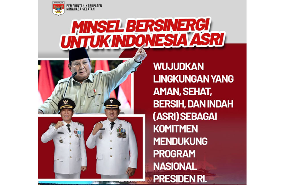 Bupati Minahasa Selatan, Franky Donny Wongkar, S.H., dan Wakil Bupati Minahasa Selatan, Brigjen TNI (Purn.) Theodorus Kawatu, S.I.P., bersama segenap jajaran Pemkab Minahasa Selatan berkomitmen untuk terus mendukung pelaksanaan Gerakan Indonesia ASRI melalui kegiatan yang terencana, terarah, dan berkelanjutan dalam rangka mewujudkan kondisi lingkungan daerah yang bersih, sehat, tertata, serta mendukung peningkatan kualitas hidup masyarakat.
