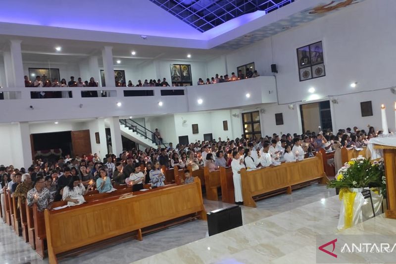 Perayaan Misa Vigili Paskah yang dipimpin Pastor Keuskupan Manado, Emmanuel Ohoiwutun, diawali dengan Upacara Cahaya dari depan gereja tersebut.